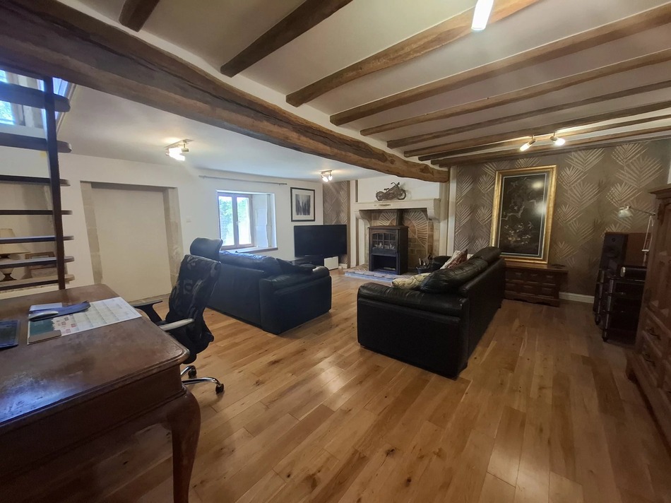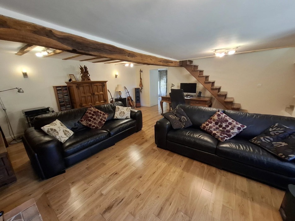 It is set in a private gravelled courtyard with mature shrubs and trees, with south-facing covered terrace with access to the house through the large kitchen diner ...ideal for al-fresco summer dining. The kitchen has an island and a wood burner.