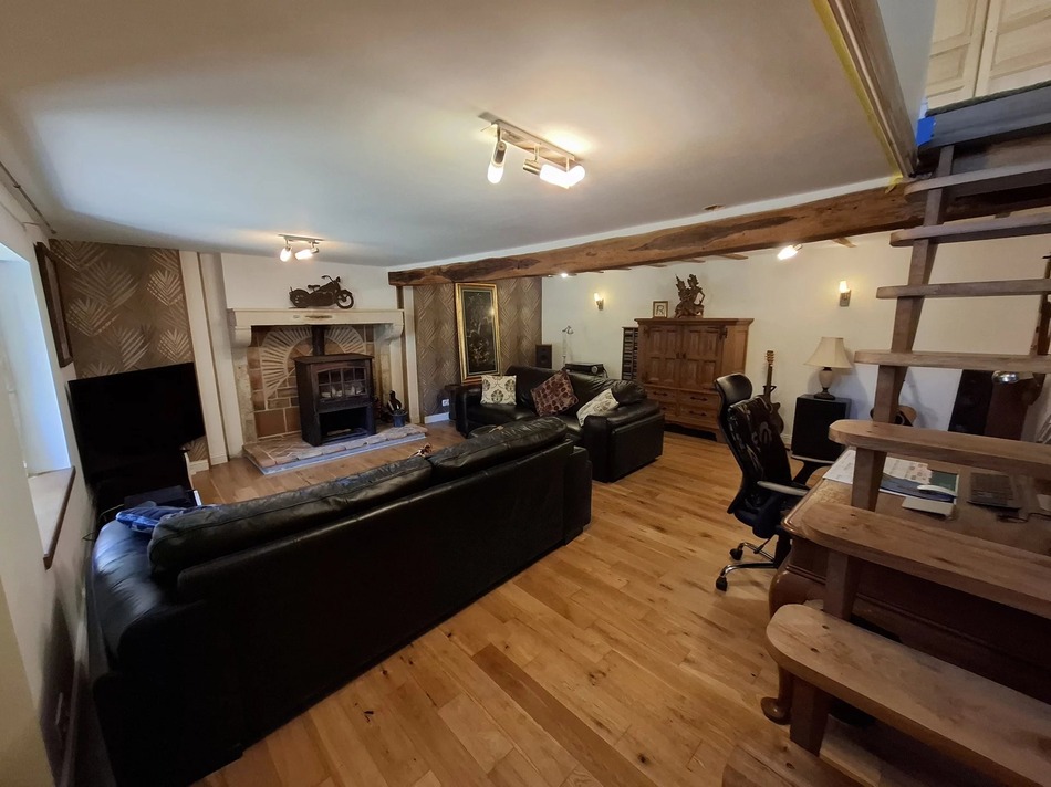 A hallway/snug leads from the kitchen to a ground floor bedroom, modern bathroom and then to a spacious oak-floored living room with an attractive hand made fire surround to set off the wood burner. Stairs lead up to 2 further bedrooms and large walk in storage cupboard.