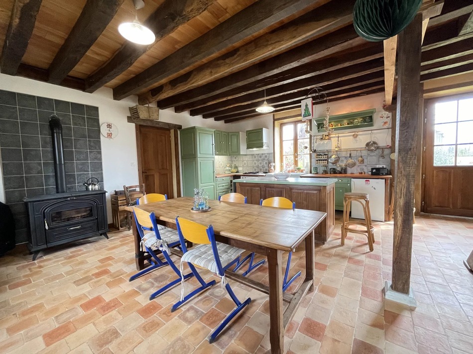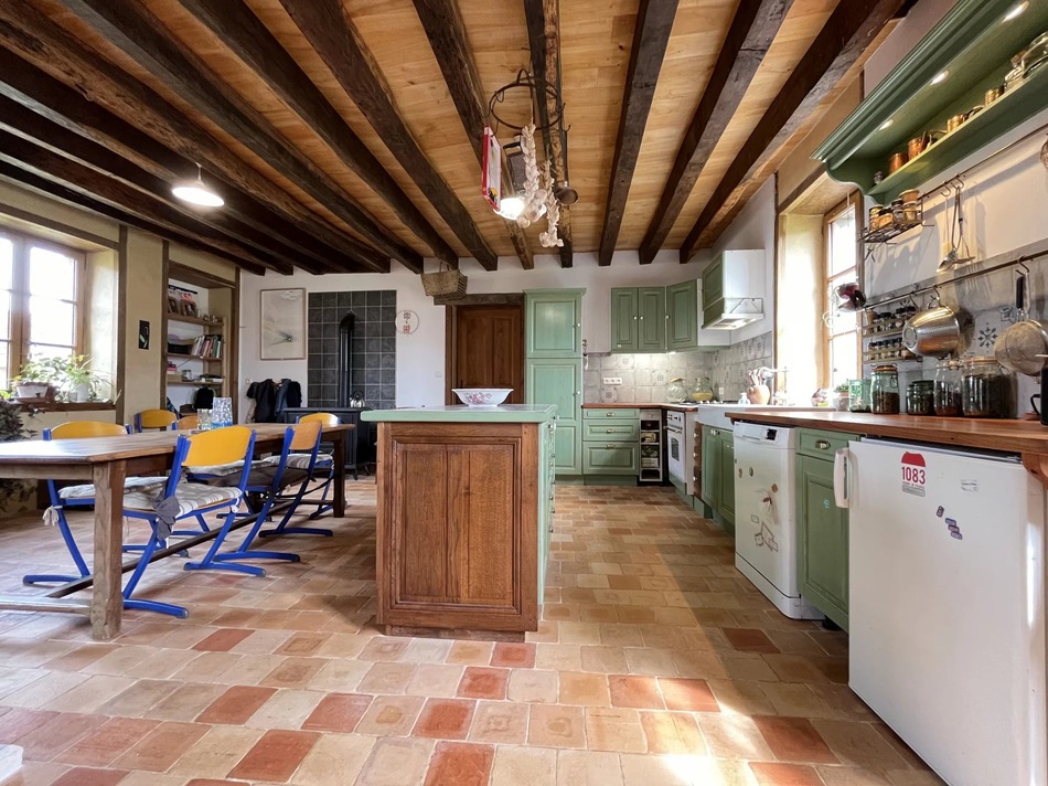 Large entrance providing a practical space for boots and coats, a laundry/utility area, small cellar and a mezzanine. The kitchen, dining and living areas are all open plan, with 2 wood burning stoves, with the stairs to the first floor in the middle of the room. It is a bright and light space throughout, full of character and ambiance. The wc and bathroom for the property are located on the ground floor.