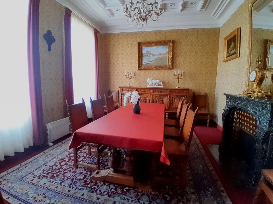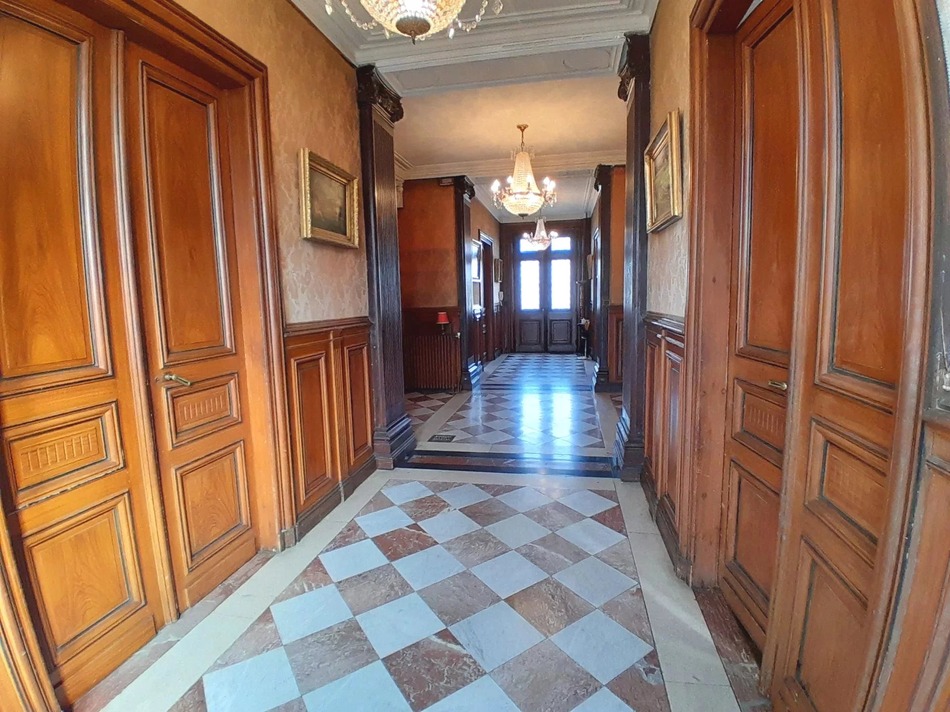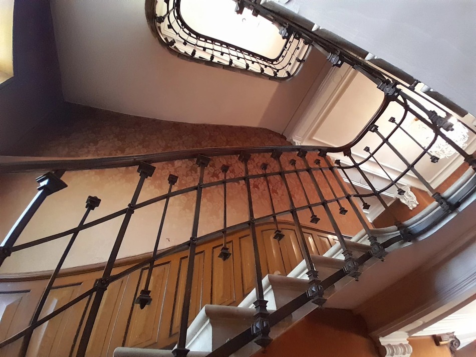 Set in its fully enclosed grounds of just over 2000m², the property can be accessed through large decorative gates to the front, leading to a parking area, and also via a solid wooden door which leads to the walled garden at rear of the property. The front and rear aspects of the house boast twin stone staircases, which give access to the main entrance doors. On entering the house you will be met by a truly impressive entrance hall, running the full length of the ground floor and displaying the gently spiralling staircase with stained glass windows. On the ground floor there are 4 large, light and airy reception rooms, currently used as a living room, dining room, library and study. The main kitchen is also located on the ground floor, along with a WC.
