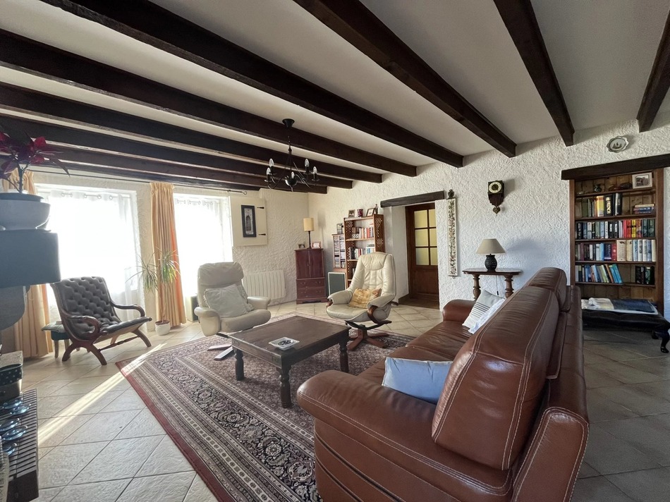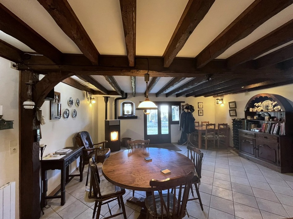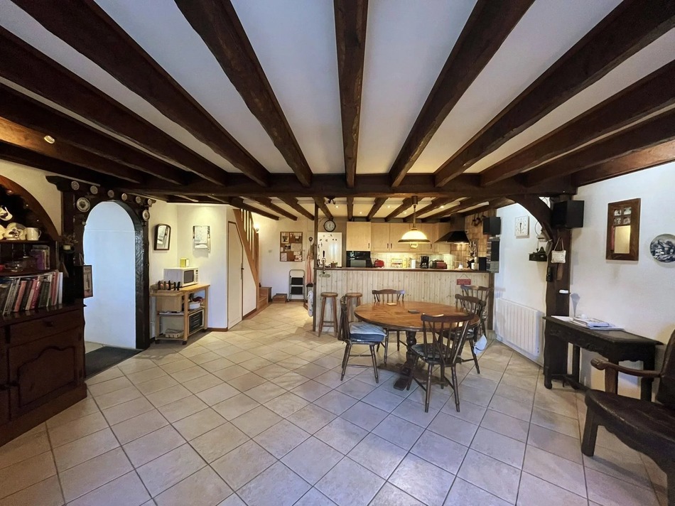Inside, the ground floor showcases beautiful wooden beams throughout. You'll find a spacious dining room that flows into an open kitchen, complete with a powerful pellet burner. A large, dual-aspect lounge offers access to an office, a WC, and a utility room. Notably, this area has its own entrance and, subject to necessary permissions, could be converted into a small gîte.
