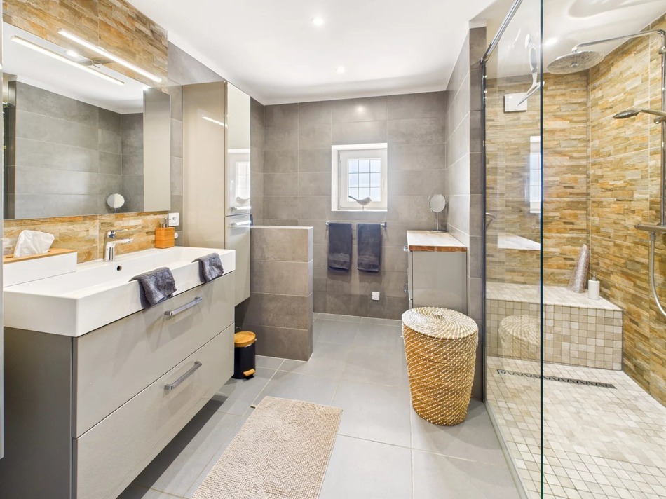 The beautifully landscaped gardens wrap around the property, featuring mature trees, lush shrubs, and multiple sunny spots with seating areas to relax and unwind. The heated in-ground pool is complemented by a spacious terrace, a bar area, and a sheltered space perfect for outdoor dining, alongside a boules court for leisure. With more than a hectare of land, there's ample room for outdoor activities—or even to accommodate a horse or two. Generous gravelled parking is available for several vehicles, including a covered area for two cars.