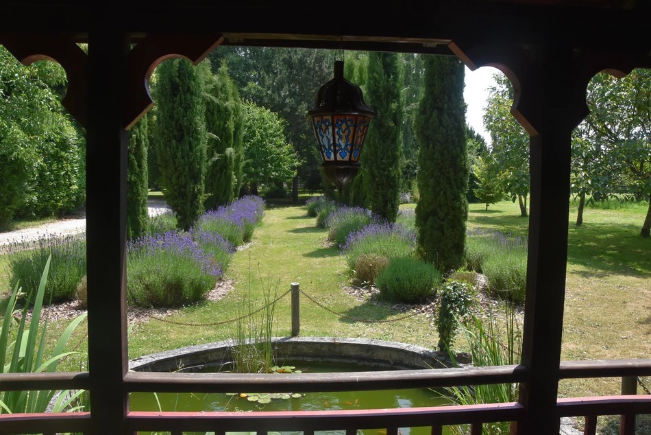 A beautifully designed garden featuring water elements, a fish pond, old statues, unique trees, a fruit orchard, and a vegetable garden.