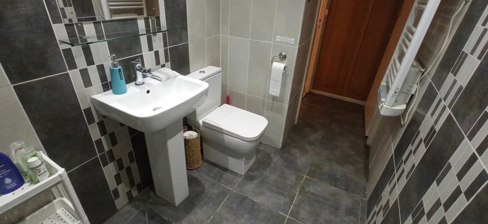 Here is another kitchen/dining/living space, and stairs to three bedrooms—two spacious and bright, plus a smaller room now in use as a children’s room. There’s also a shower room and separate toilet.