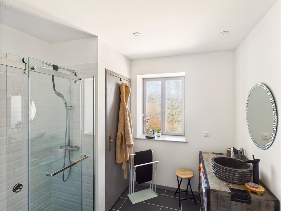 The house offers a very spacious living area, with on the ground floor, a fitted kitchen, a shower room, a lounge with a wood-burning stove, a dining room, a bedroom, a dressing room and a bathroom. Upstairs, a beautiful landing leads to 5 spacious bedrooms, 2 shower rooms and a toilet.
