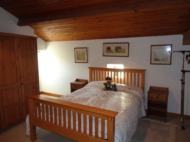The house comprises an entrance hall leading to a fitted kitchen, a spacious living room featuring a wood-burning stove, and a separate dining room. Also on the ground floor there are two bedrooms, one currently used as an office, along with a bathroom with WC and a walk-in pantry. Upstairs, a central landing leads to two generous bedrooms, each benefiting from its own en suite bathroom.