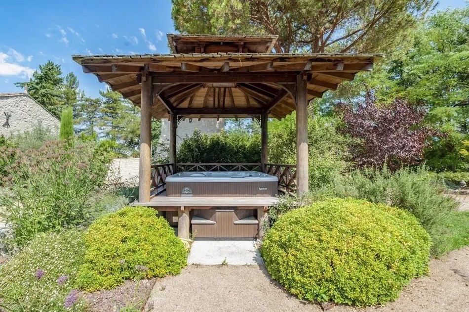 The heated saltwater infinity pool is framed by two cascading waterfalls built into a stone wall. The surrounding wooden terrace offers generous space for sunbathing and entertaining. A staircase leads to a gazebo with a daybed, and further down, a designated parking area with a garage and workshop.