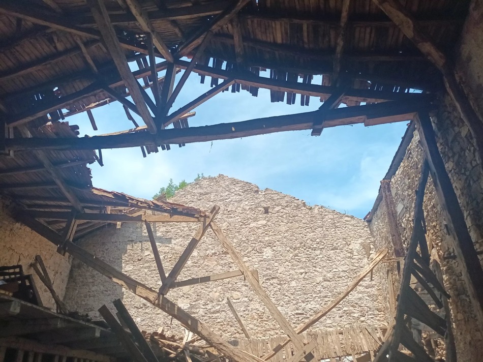 Ground Floor: Utility/Bathroom (currently empty) leading into the kitchen; leading into the living and dining area with elegant flooring, exposed stone wall and beams and open fireplace.