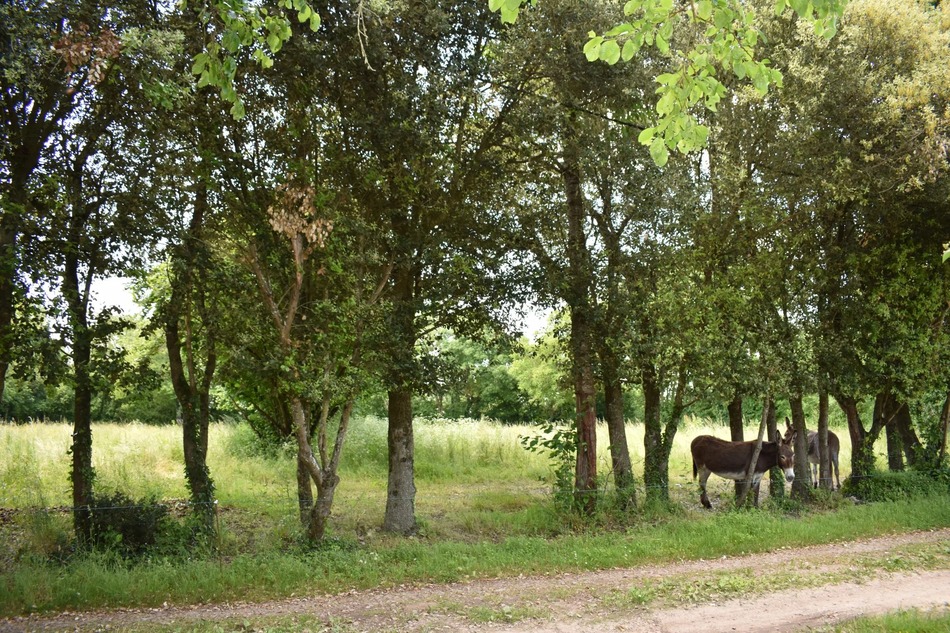 In front of the house, the bucolic gardens are very private, with streams on both sides and a flat field now used as a donkey meadow. Behind the property, there is parking for several vehicles, a large covered area suitable for camper vans, an old pigsty, a hanger and a barn.