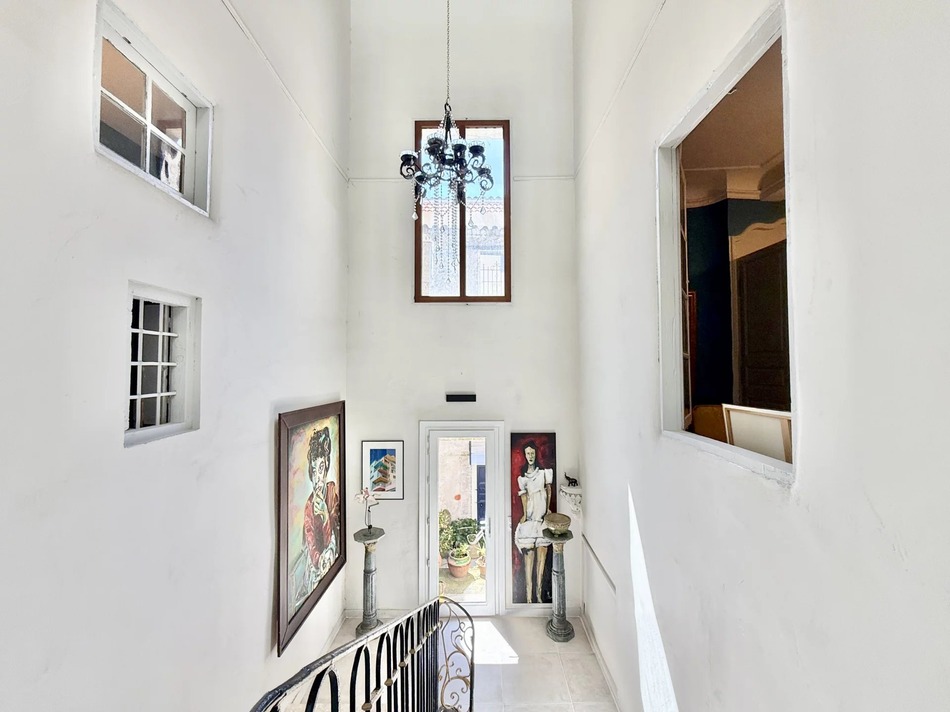 The new spacious kitchen features a central island with plenty of seating area, it flows into a study space and the central hallway with ample storerooms for food and wine! Opposite is the beautifully preserved dining room with original decorative tiled floors and Baroque-style arched niches in the walls.