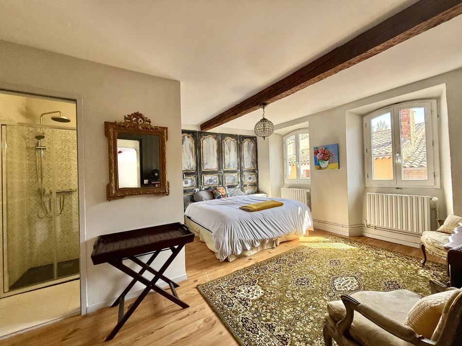The bedrooms and reading room on the first floor are grandiose and architecturally interesting. There is a statement bathroom decorated in rich blues and gold. The second floor features charming bedrooms and a beautiful salon at once cosy and airy. The top floor attic has been converted to a sizeable working artist's studio with an elevated roof terrace overlooking the village and impressive mountains that the town is famous for.