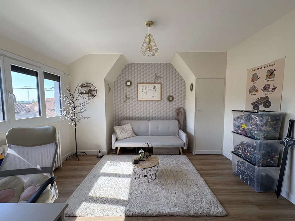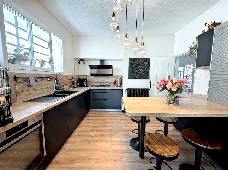 The house was built in 1965 by the Compagnons du Devoir, a prestigious French guild of master craftsmen whose roots date back to the Middle Ages, renowned for their traditional expertise, precision and commitment to excellence. Rounded plaster covings, an elegant wooden staircase and custom-made joinery set the tone. On the ground floor, there’s a lovely living room with exposed stonework, a bedroom and a kitchen that leads into the back garden. On the first floor, the original door leads into a bright living room with original wooden floors and a pellet stove. A little balcony is accessed by the living roomt. The dining room is perfect for family dinners. The bedroom, which features original joinery, has an ensuite bathroom. A veranda next to the modern kitchen makes an additional dining room in spring and summer. The second floor offers two bright bedrooms with wooden floors, and a modern bathroom with both a bathtub and a shower.