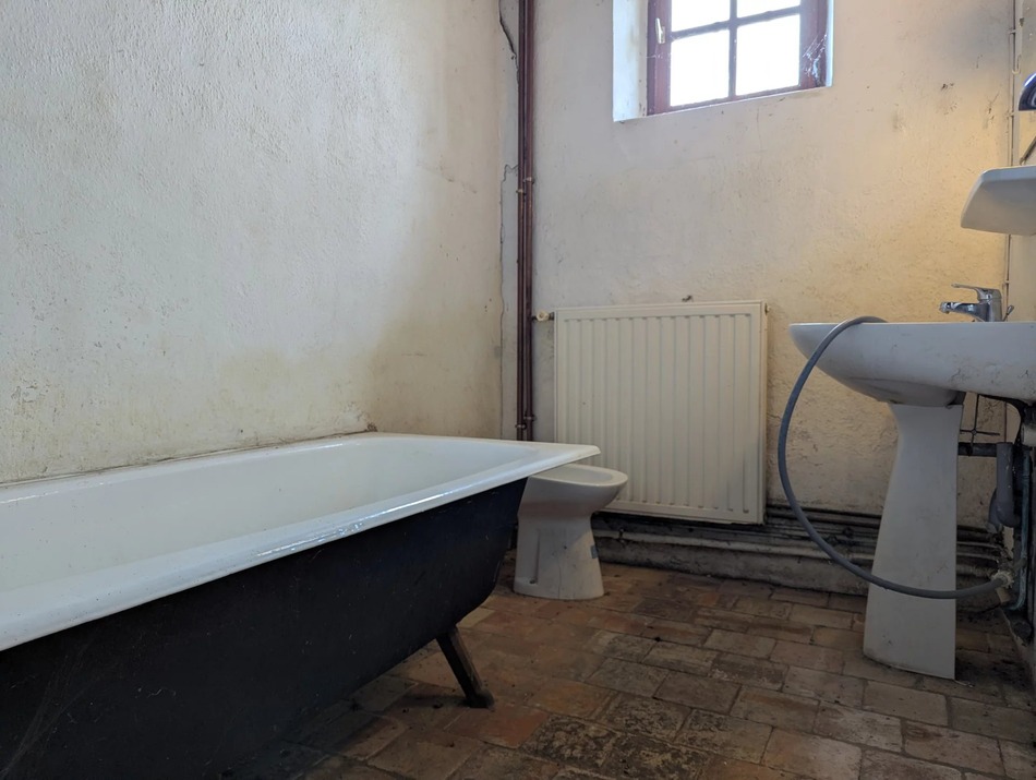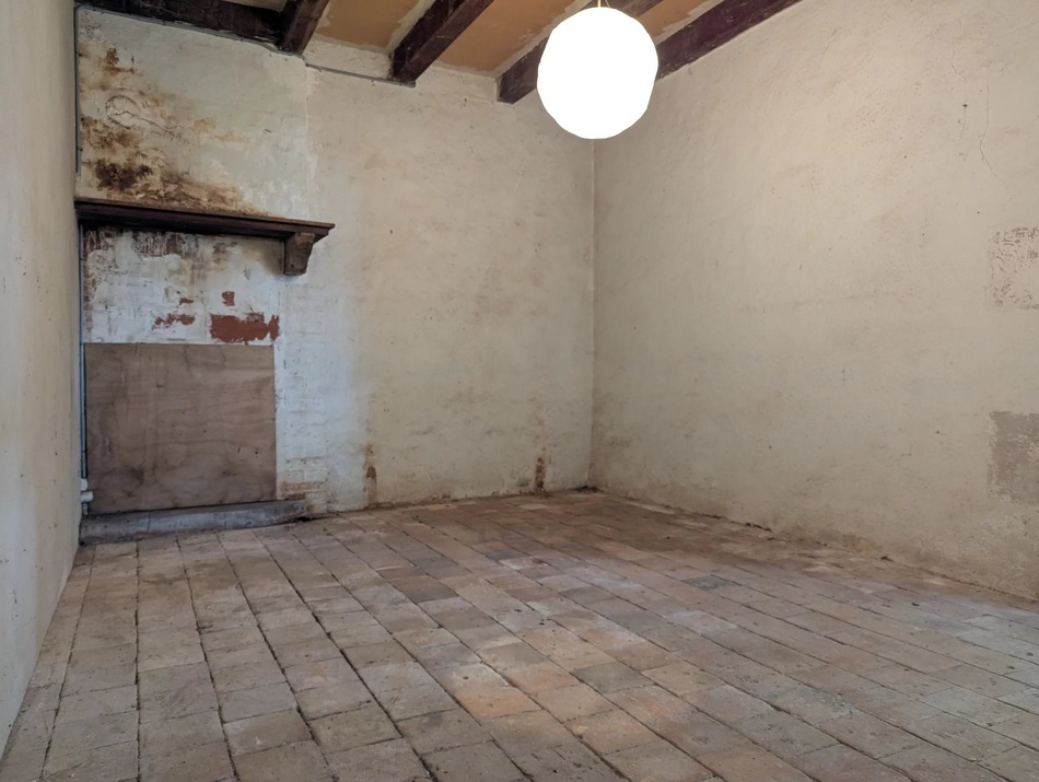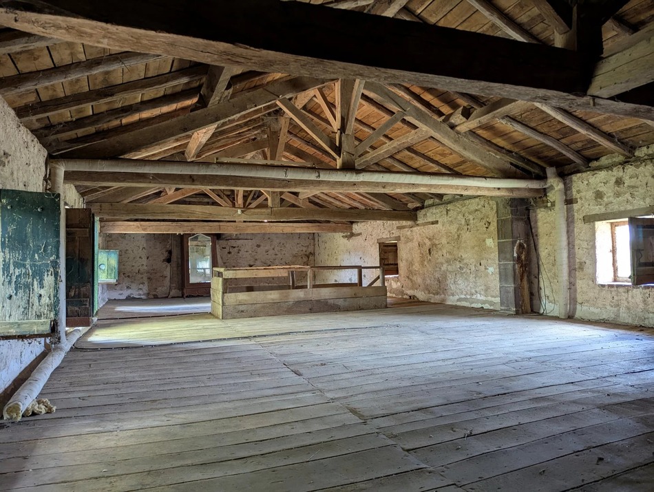 On the ground floor, the living accommodation comprises a spacious living/dining room, a kitchen, a separate WC, a bathroom, and two double bedrooms. The property is flooded with natural light, which beautifully highlights the charming tomette tiles and original wooden beams, adding to its unique appeal.