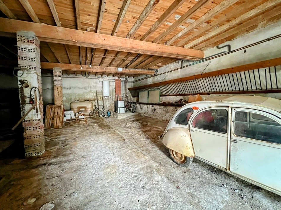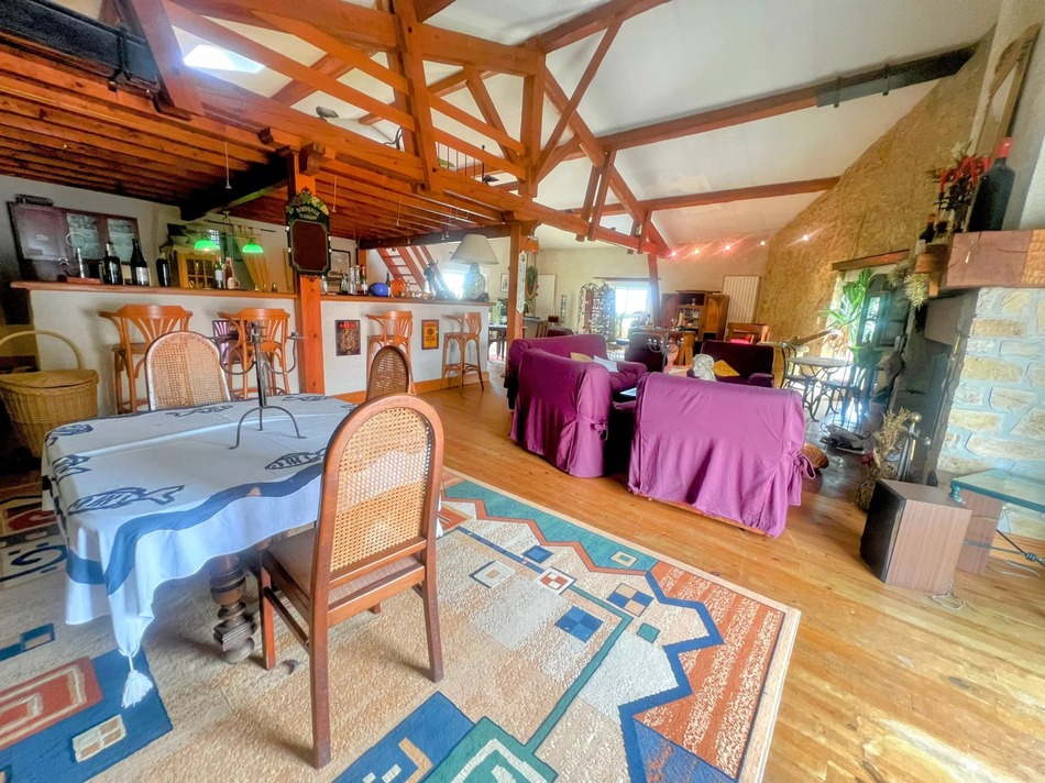 Upstairs, the first floor boasts a generous 130m² open-plan living and dining area with a central kitchen, feature fireplace, exposed stone walls, and beautiful wooden floors and beams. Patio doors open directly onto the garden, bringing in natural light and connecting the indoors with the outdoors.