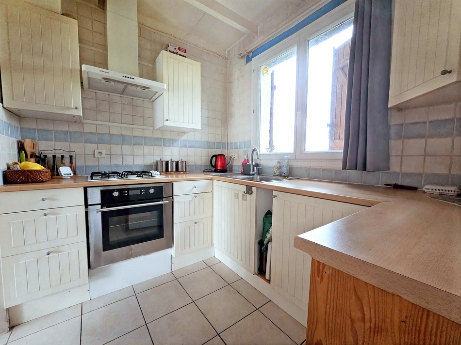 While the property could benefit from some updates, it currently comprises a bright, glazed veranda, a cosy living room with a fireplace, a fitted kitchen, a bathroom with WC, and two bedrooms. Additionally, there is a 20m² garage with a glazed door, offering potential for conversion into extra living space, providing even more possibilities (subject to necessary permissions).