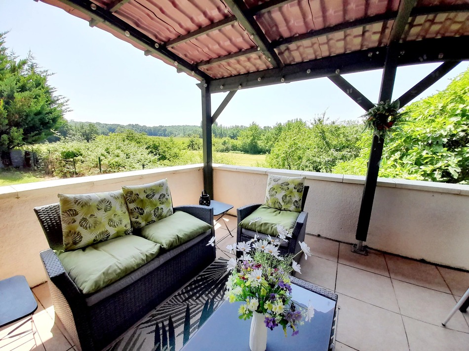 Set apart from the main house, the self-contained gîte boasts a fabulous covered terrace with lovely views, as well as two further bedrooms, each with its own private shower room—ideal for visiting family and friends or for seasonal rental income (a future owner would need to obtain necessary permission and appropriate business registration).
