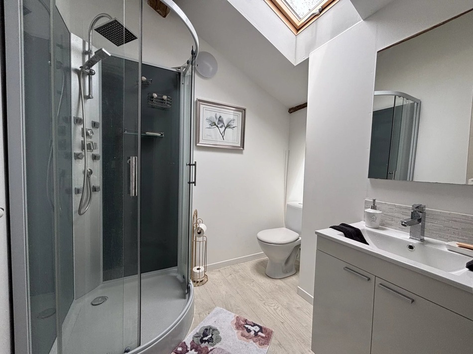 On the ground floor, the property features an entrance hall, one bedroom, a living room with a wood burner and a kitchen/dining room that provides access to a courtyard. Additionally, there is a shower room with a WC and a garage that includes a laundry room and an old toilet.