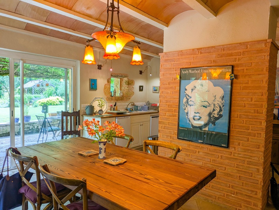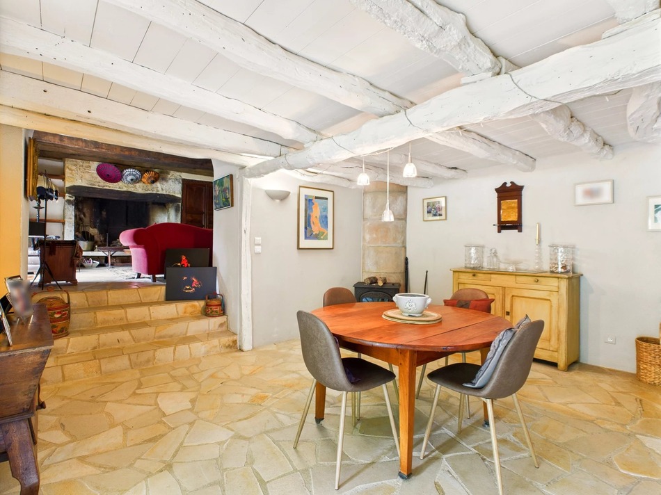 The house provides around 250 m² of living space. A stylish kitchen leads into a generous dining room which opens onto a wisteria-covered terrace, ideal for indoor/ outdoor entertaining. This flows into the charming living room with a large stone fireplace perfect for cosy winter evenings. A second sitting room provides a comfortable alternative space for relaxing with family and friends.