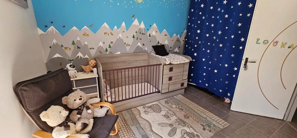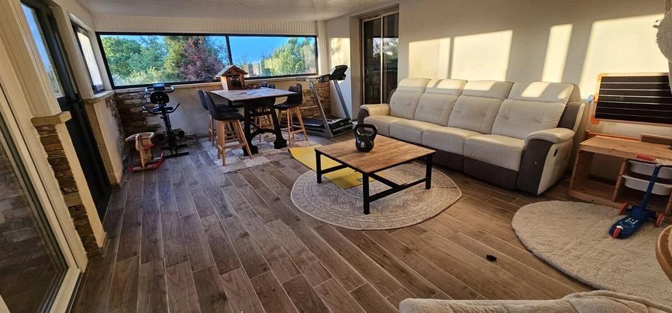 The spacious, air-conditioned living room is bright and inviting, featuring an open-plan kitchen area. It flows seamlessly into a recently added dining room and playroom, both offering delightful views over the garden and surrounding countryside.