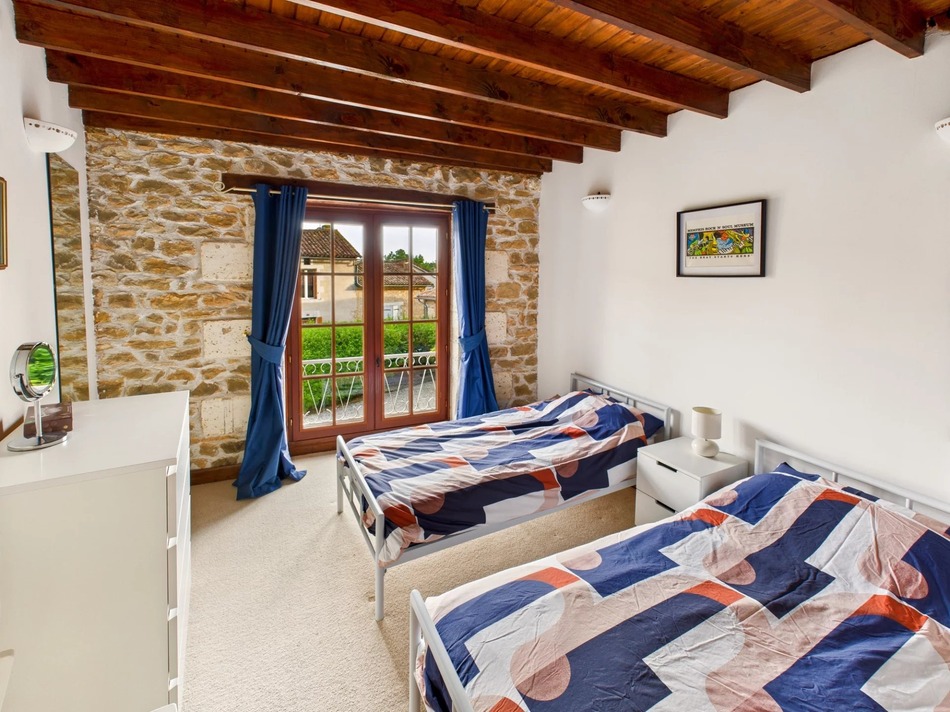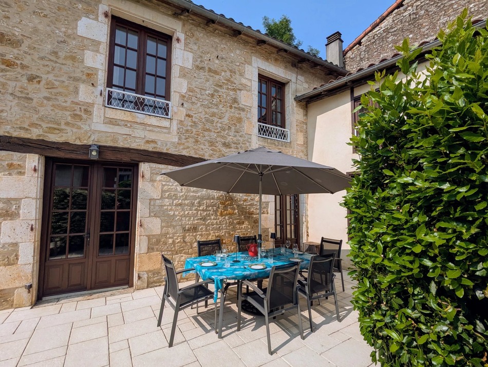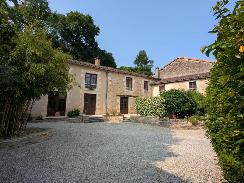 This particular property is more likely to turn the heads of visitors to the Village of Nanteuil-en-Vallee than any property, with its ornate white metal double gated entrance and wide sweeping stone driveway and elegant stone frontage with each first floor window having “Juliette balconies” alongside the well kept and pretty courtyard garden and terraces.