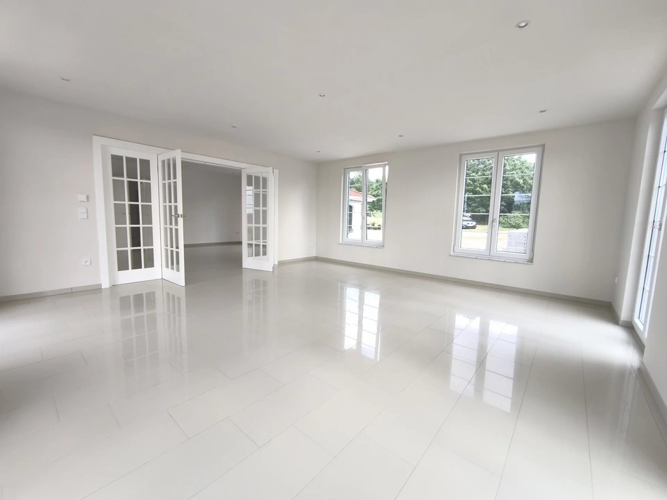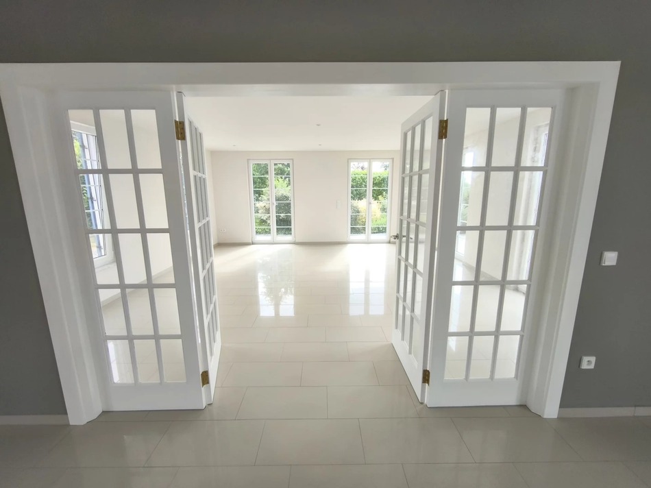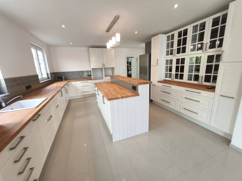 Inside, the property is finished to a high specification, including double-glazing throughout with tilt-and-turn windows. At the heart of the home lies a spacious open-plan kitchen and dining area, complete with wood worktops, a central island, and seamless access to a utility room and integral double garage.