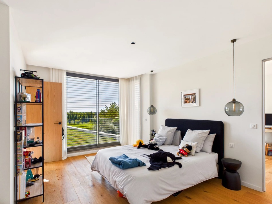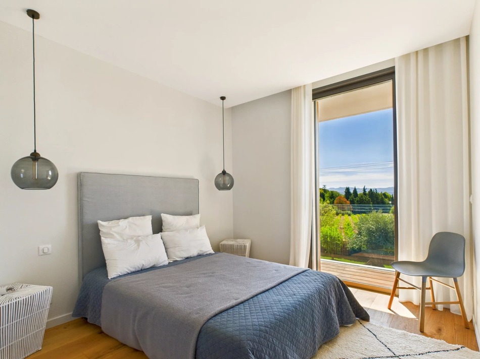 The 93 m² living area, bathed in natural light, opens through large picture windows onto a landscaped garden and offers spectacular views of the fields and the Étoile mountain range. Perfect for entertaining, it includes an open-plan kitchen, a utility room, a master suite, a guest suite, two bedrooms each with their own bathroom, an office, two garages, and two outdoor parking spaces.