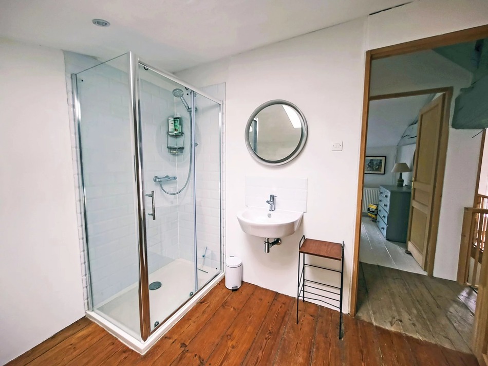 The front of the house looks southwards onto the shared, gravelled courtyard and from upstairs one can glimpse across the rooftops, the turrets of the 15th century, fairy tale chateau beyond. Inside, there is an immediate sense of calm and understated chic, the bright and welcoming hallway offering access right, to the spacious lounge with grand fireplace and wood-burning stove, and ahead, to the grand, bespoke, double-glazed conservatory with beautifully tiled floor, perfect for not-quite al fresco dining on cooler evenings. To the left of the entrance hall and connected by two doors to the conservatory and beyond to the garden, is the heart of the home, the large kitchen-dining area with a second, very handsome, wood-burner and gorgeous wooden flooring. Still on the ground floor, there is a smaller, cosy living room or “cwtch”, which is currently used as a TV room, but could easily become a study or office.