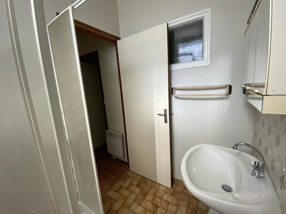 Inside, the ground floor offers a kitchen, a living room, and a bathroom with toilets. Upstairs, there are two bedrooms and a shower room.