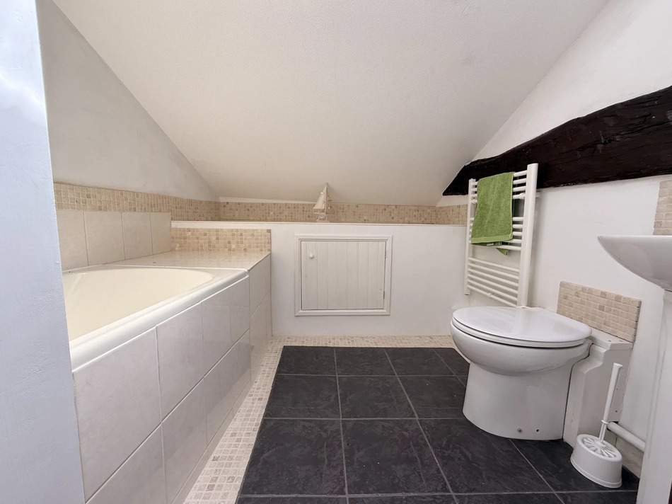 Upstairs are two further bedrooms, one with an ensuite bathroom. The twin bedroom also enjoys its own private access down to the garden, offering independence for guests or family.