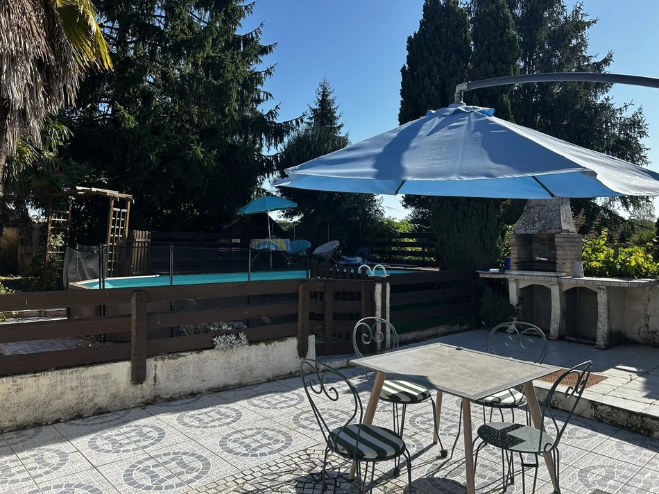 Situated just 5 minutes from the ever popular town of Jonzac with its shops, bars and restaurants sits this delightful stone cottage boasting 3 bedrooms, rear terrace with above ground pool, gated driveway leading to large garage and super gardens backing on to open fields.