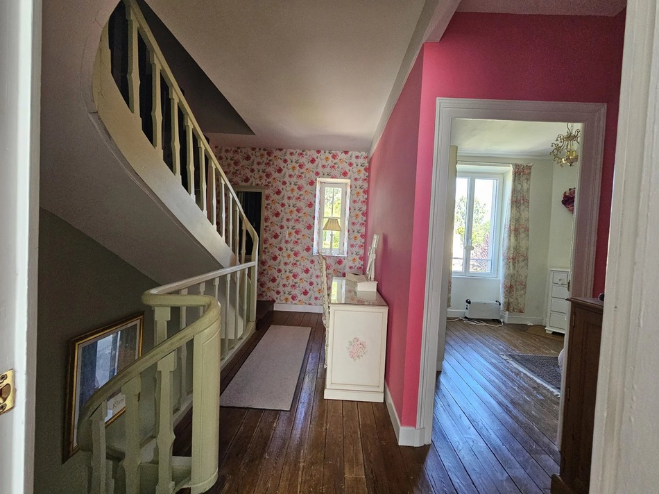 Situated in a vibrant village with all essential amenities, the property offers a perfect blend of character and comfort. Step in from the terrace into a bright and airy hallway with a convenient WC. You'll immediately notice the home's unique charm—flowing staircases, elegant wooden floors, chandeliers, and period features throughout.