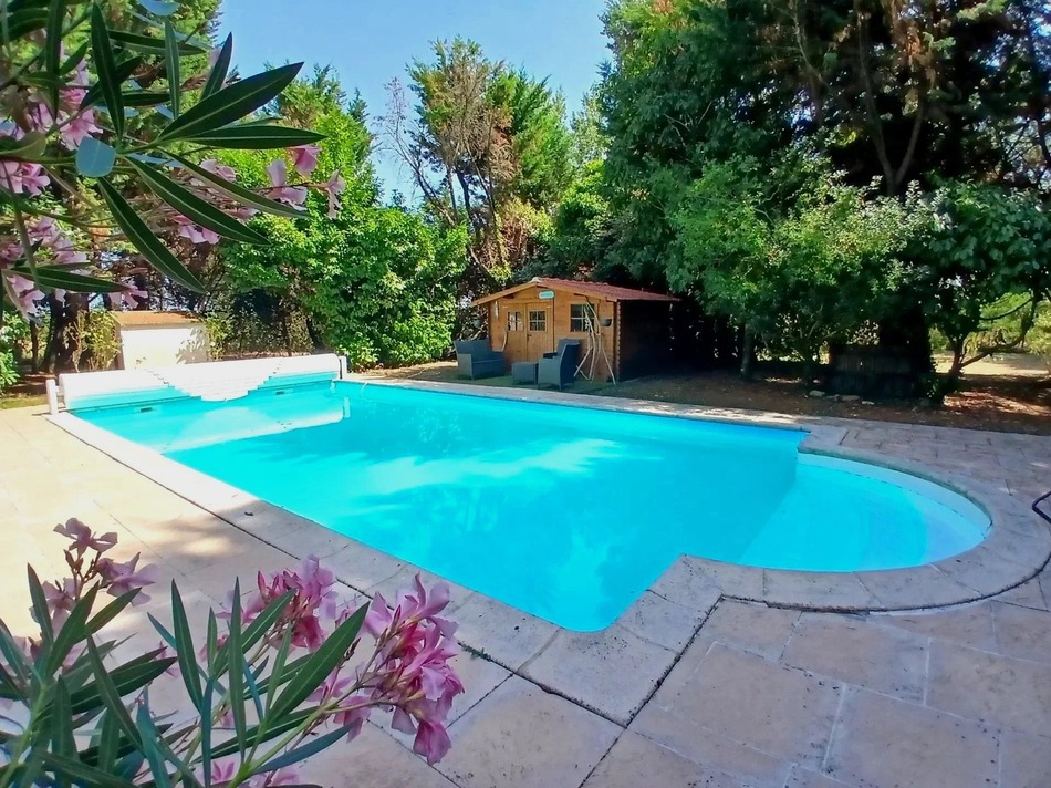 Further there is a large attached garage with loft space, another separate garage, a workshop with small covered terrace, a pool house and a pétanque court.