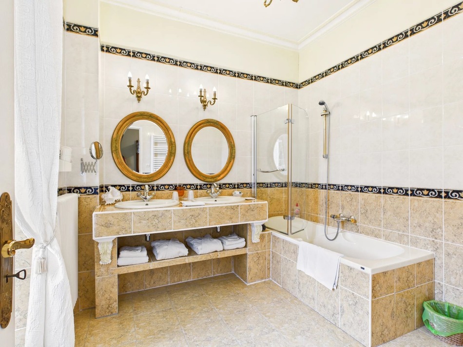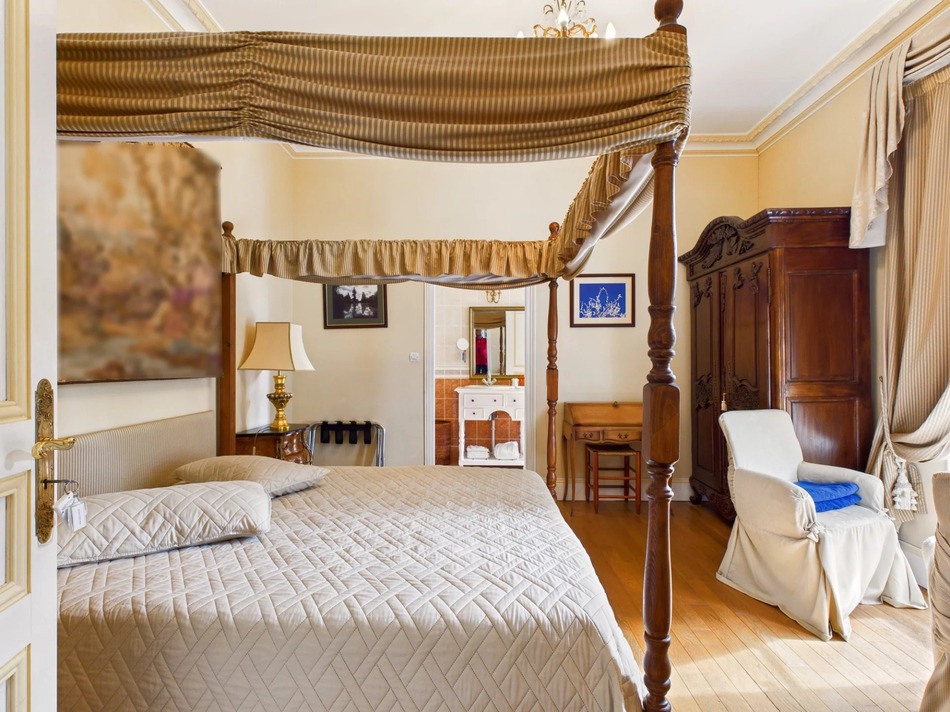 The side towers house graceful staircases leading to the upper floors, where eleven refined bedrooms unfold, each with its own en-suite bathroom. In the basement, a dining room and a kitchen dedicated to guests have been fitted out to meet the needs of the current bed-and-breakfast operation.