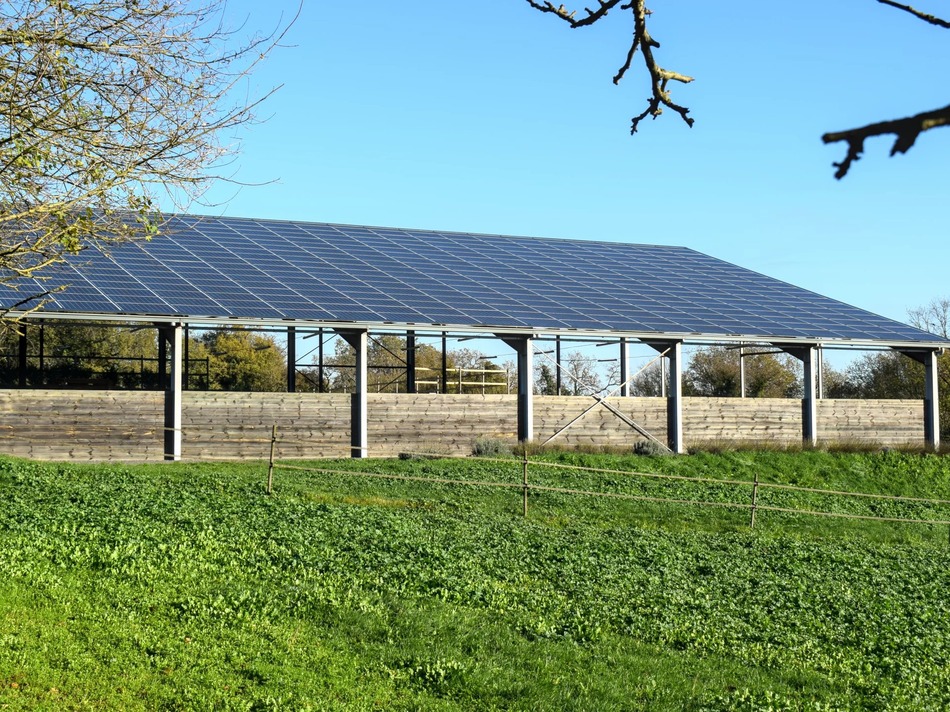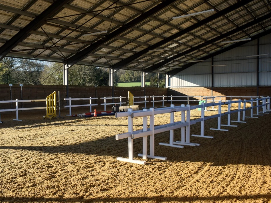 An income producing photovoltaic building which houses an illuminated indoor riding arena (36x18m) with high-performance fibre surface
