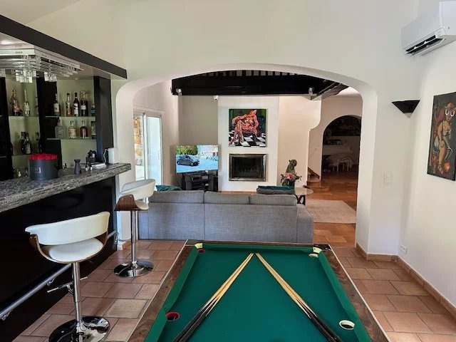 The main villa, spanning 300 m², features generous, light-filled living spaces and high-end amenities: an impressive reception hall, a fully equipped independent kitchen, a double living room with billiards, bar and fireplace, and an elegant dining room. Two ground-floor en-suite bedrooms provide comfort and accessibility.