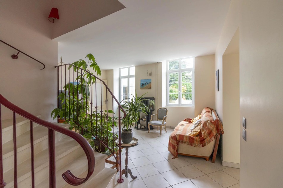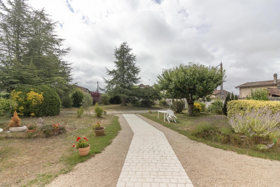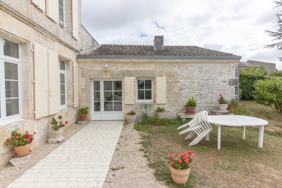 This Charentaise stone house overlooks a large courtyard and has gardens to the side and rear, offering ample space for parking and a garage area.