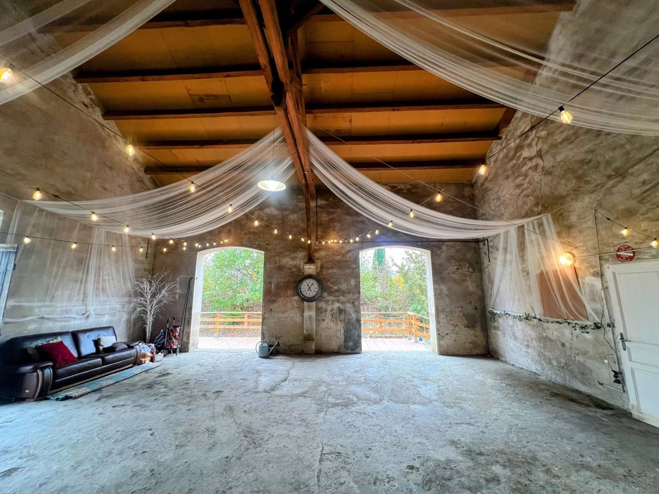 Attached to the main house is the former carriage house—an impressive double-height space with doors on three sides. This dramatic area offers huge potential: it could be converted into a gîte, studio, guest suite, or retained as a striking workshop (subject to any necessary permissions).