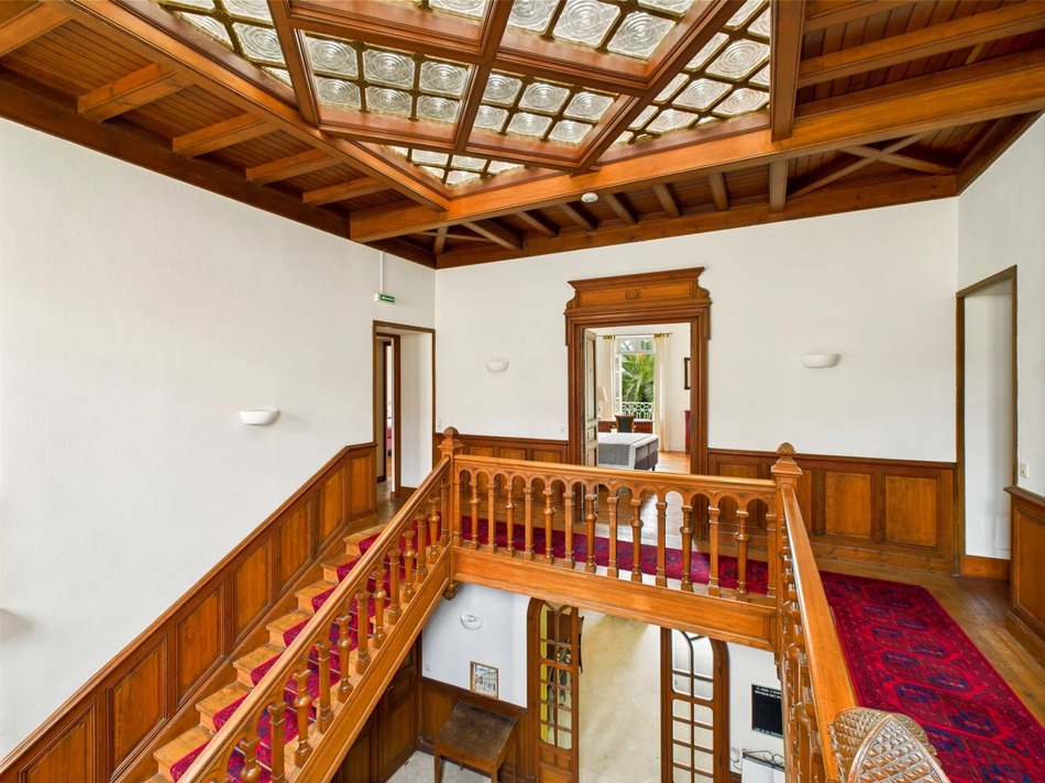 Upon entering the property through the double front doors, you are welcomed into a spacious hallway, lined in oak and a sweeping oak staircase, with a glass ceiling letting in natural light. From this space, you can access the dining room, library, sitting room, kitchen with laundry and pantry, 2 wcs and an office. There is also a separate access to the kitchen.The dining room leads out to the terrace, landscaped gardens and the pool area. There is a side gate giving access to the street.