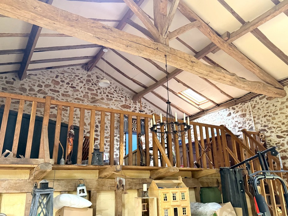 The property also features a superb double-height room with a mezzanine, offering endless possibilities — a stunning main living area, games room, studio, or, with the necessary permissions, conversion into an independent living space. This impressive room enjoys dual-aspect windows, doors opening to both sides of the garden, and benefits from its own pellet burner, ensuring warmth and comfort throughout the year.