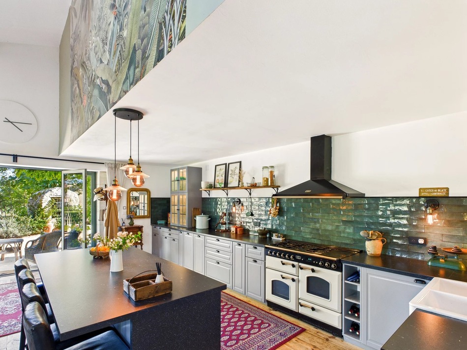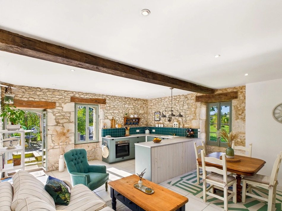Gîte Three: Situated at the rear of the property, offering a large kitchen/dining/living space opening onto its terrace and the garden with the pool, plus a generous bedroom and a stylish travertine-tiled shower room with bespoke sink area.