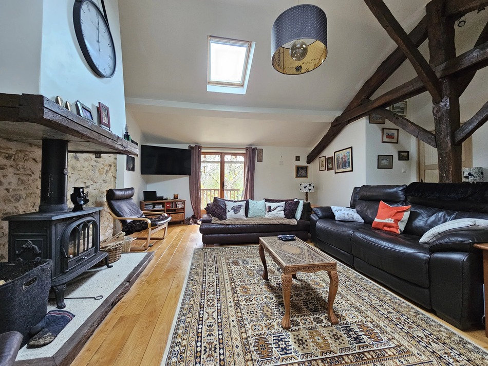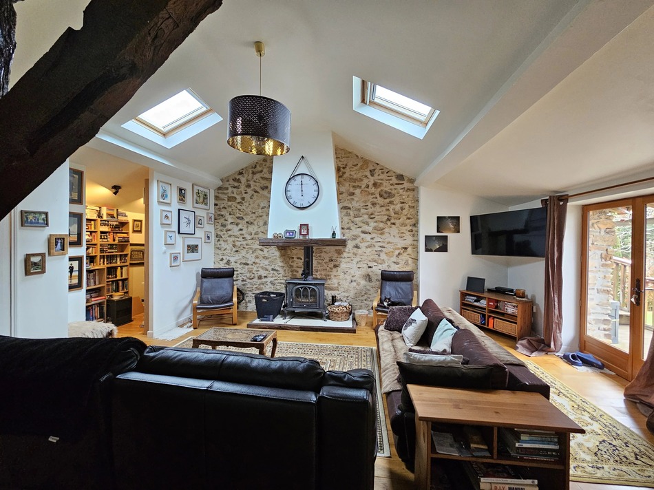 The main house showcases beautiful exposed stonework and traditional beams, creating a warm and inviting atmosphere. The layout includes a modern kitchen, generous dining room and bathroom on the ground floor, while the light-filled living room occupies the first floor with doors opening onto a balcony overlooking the garden and surrounding fields.