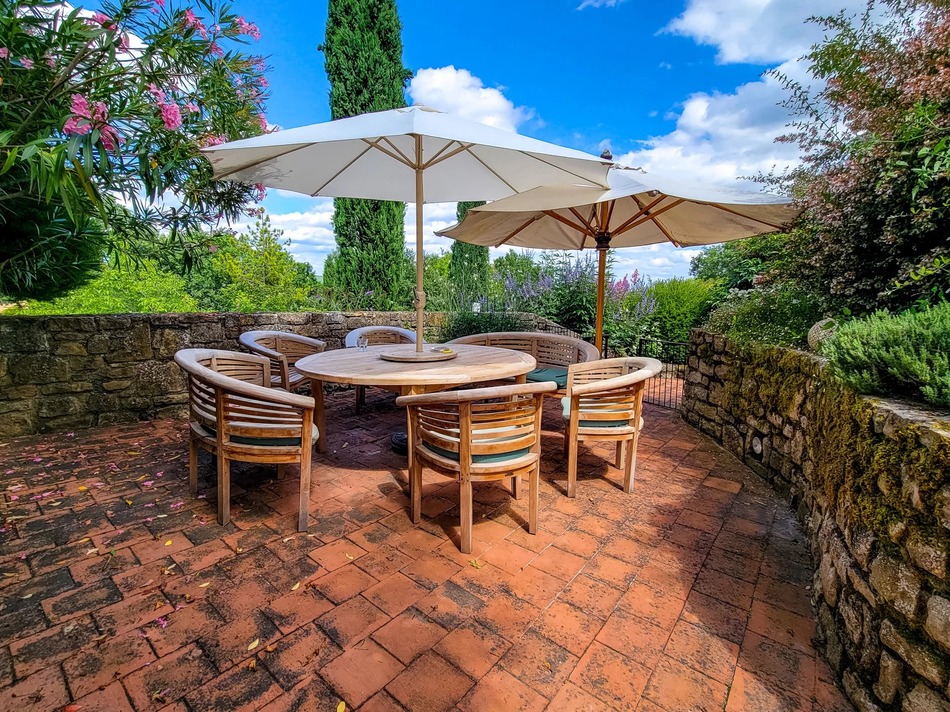 From the entrance hall, a second staircase leads to the west wing, which comprises three ensuite bedrooms. One of these bedrooms opens onto a west-facing terrace with exterior steps descending to the courtyard garden.