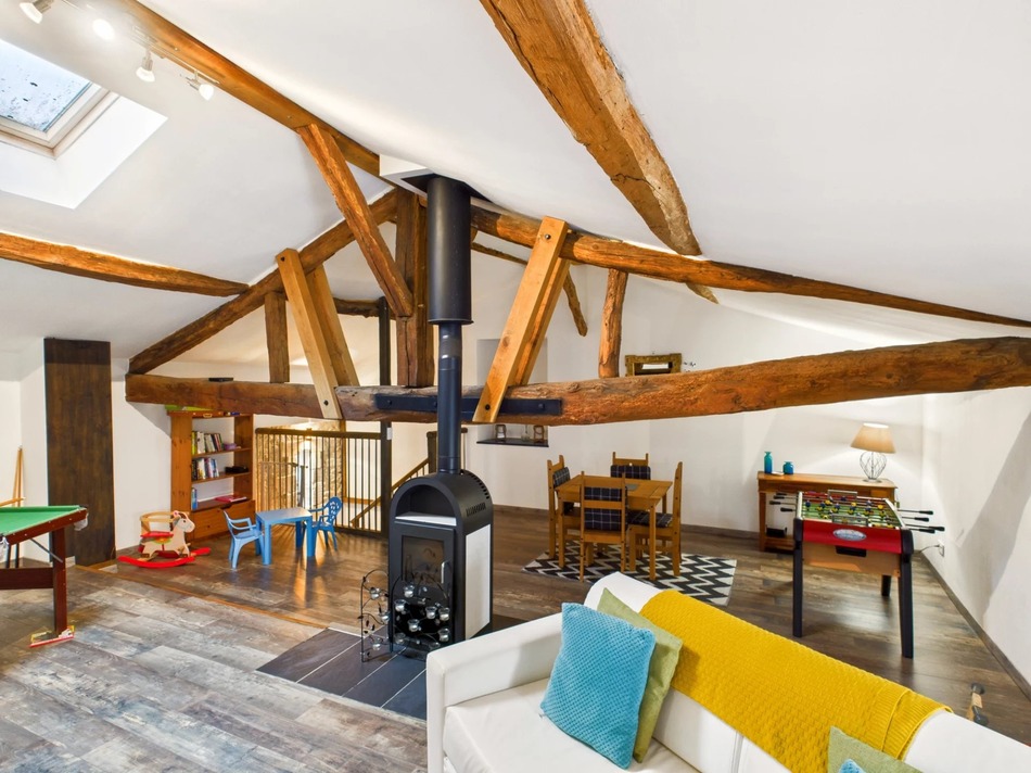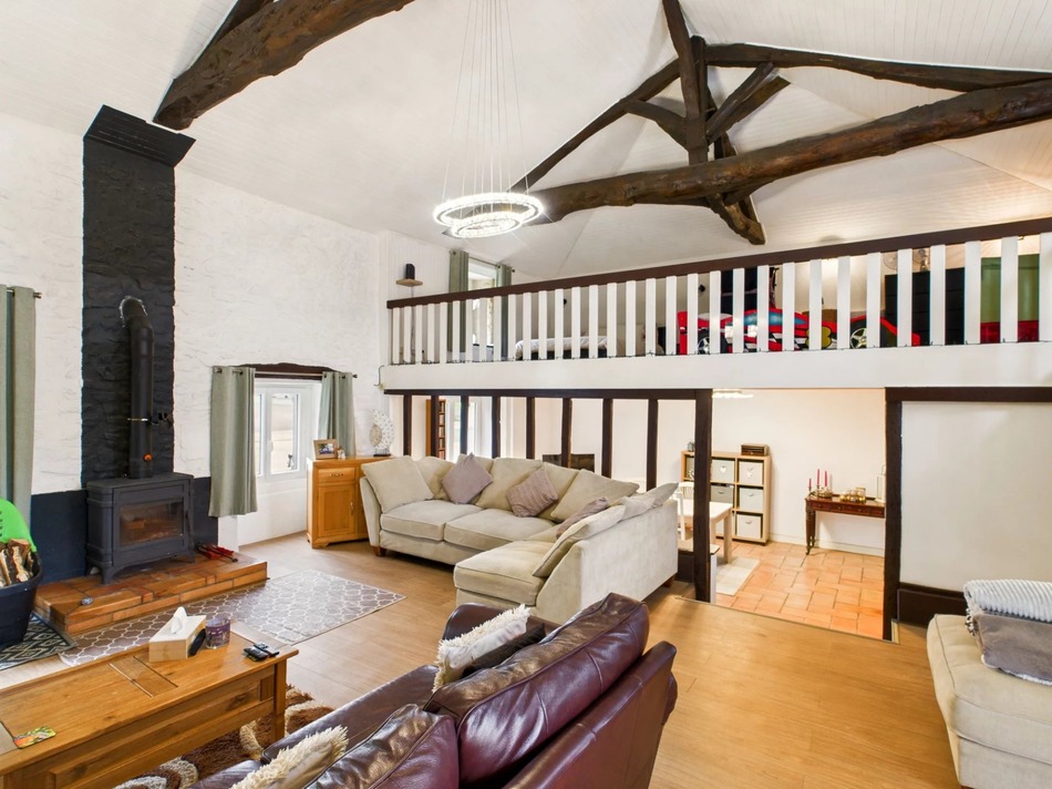 The main section of the house comprises a newly-fitted, eat-in kitchen, off which is a shower room and corridor leading to the master bedroom with en suite shower room and WC; stairs lead down to a basement snug, bedroom and utility room/cellar. Back up to ground floor level, the kitchen leads on to a 70m² living room with separate dining and seating areas - the woodburning stove being the focal point of the latter and a 27m² multi-purpose mezzanine level completes the space.