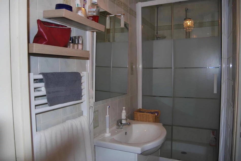 On the ground floor: entrance hall, bright living room, modern fitted kitchen, and shower room with WC.