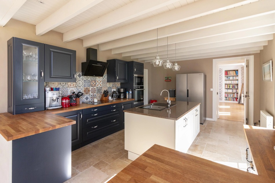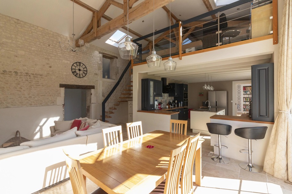 The living room has direct access to the pool terrace and leads through to the fitted kitchen. Off the kitchen is a spacious larder cupboard. From here, a doorway opens into a large living and dining room with a log‑burning stove. Stairs rise from this room to a mezzanine level, currently arranged as an office and a cosy sitting area.