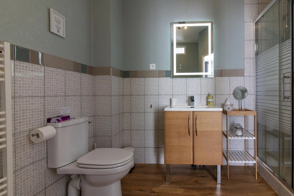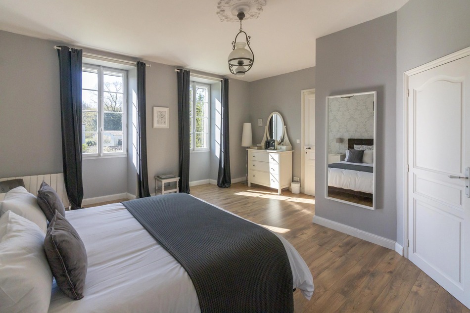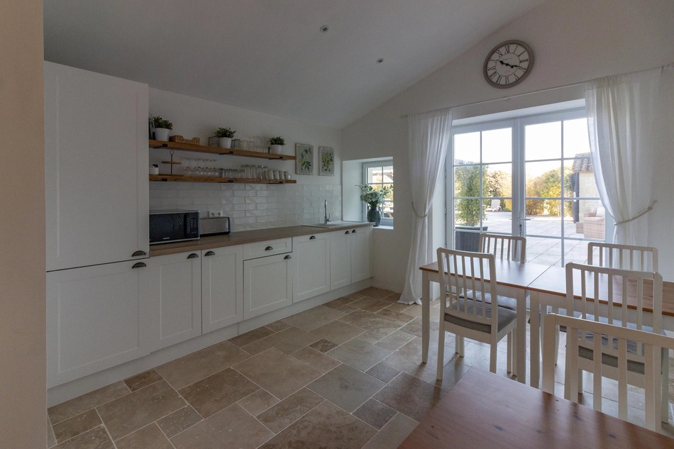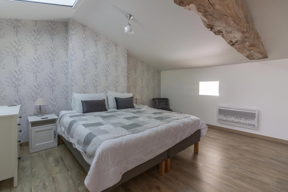 This two‑bedroom gîte offers approximately 96 m² of accommodation, combining modern comfort with original character. The ground floor includes a fully fitted kitchen and a separate lounge‑diner. Upstairs, both bedrooms benefit from private shower rooms with WCs. Outside, a private terrace with a barbecue provides an appealing space for outdoor dining.