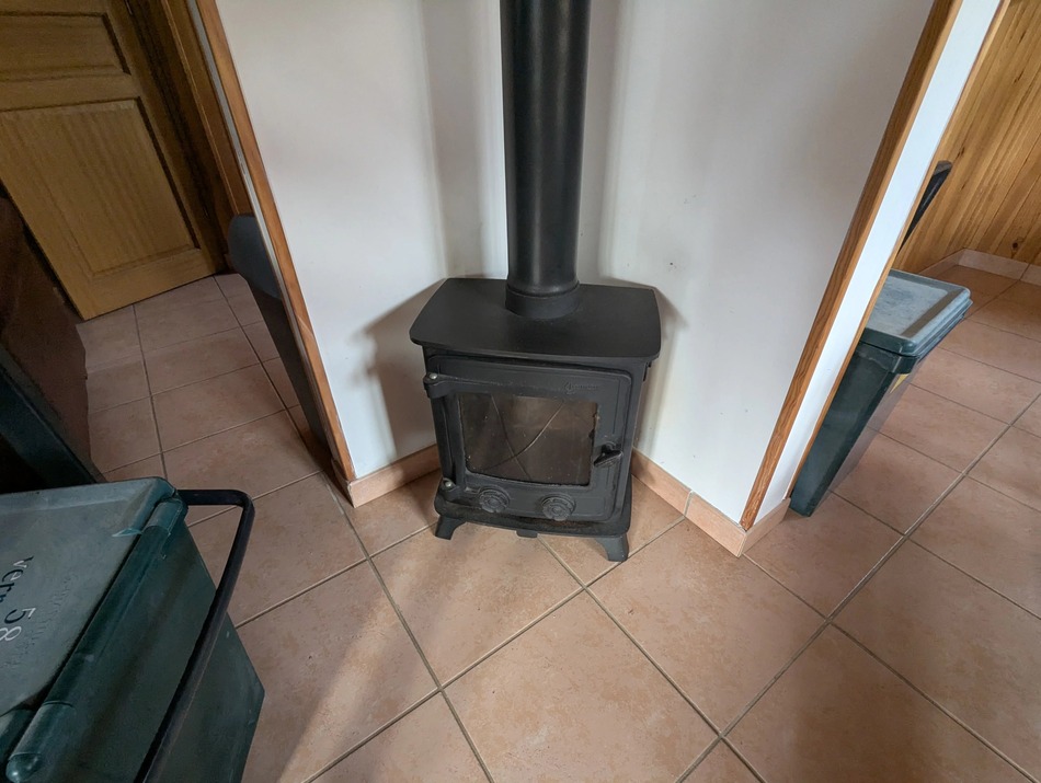 The ground floor comprises a bright living/dining area with tiled floors and a wood-burning stove, alongside a fully equipped kitchen with oven, microwave, gas hob, dishwasher and fridge-freezer. Large French doors open onto a covered terrace, perfect for outdoor dining. A recently renovated shower room completes this level.