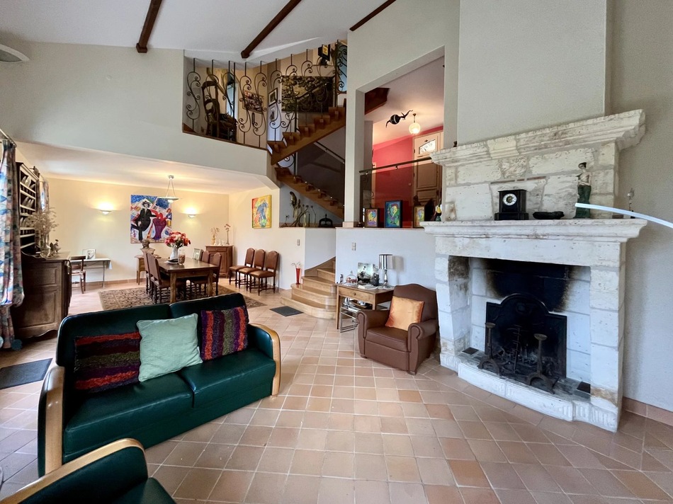 Below, the lower ground floor has been converted into a large living area with a lounge and dining area, bathed in light thanks to French windows opening onto the terrace. Underfloor heating and a fireplace add to the cosy feel of this space, which is ideal for entertaining or relaxing with the family.