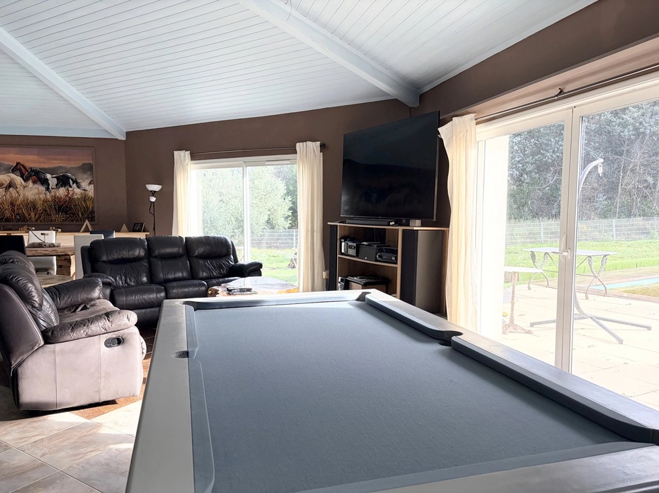 Step inside to find an exceptional open-plan living space where the kitchen, dining, pool table game area and sitting areas flow seamlessly together. With high ceilings, a central wood-burner, abundant natural light and quality finishes throughout, this home is designed for relaxed modern living.