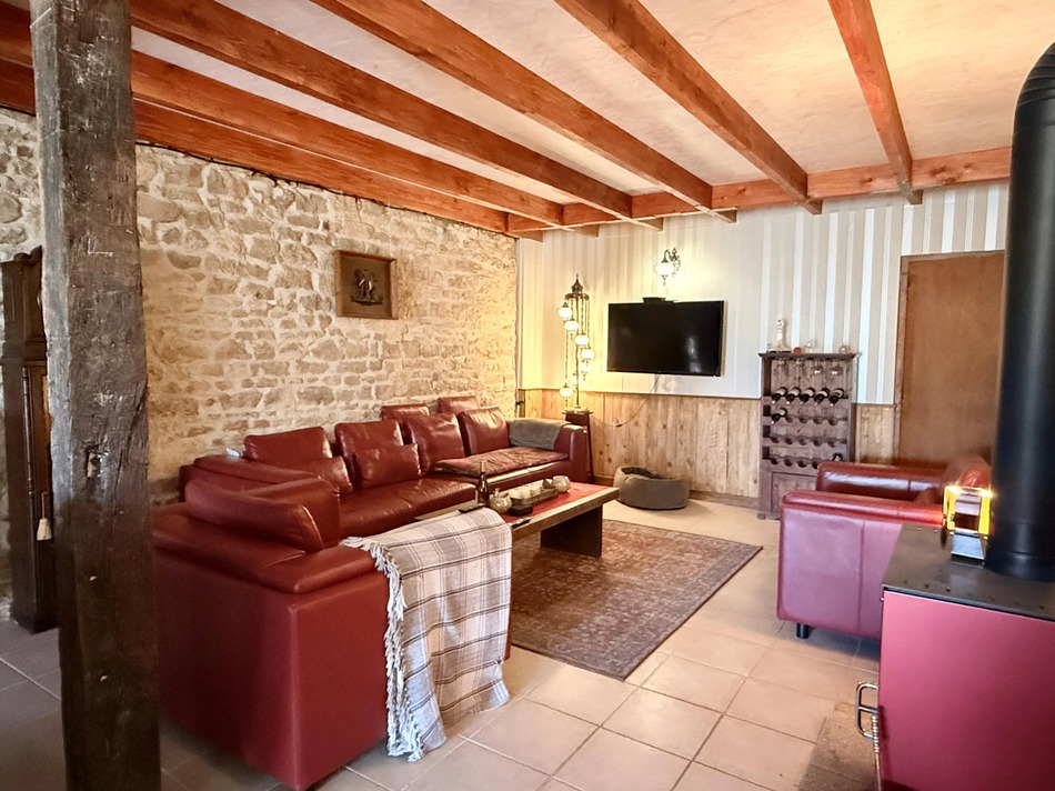 The main house offers generous living space combining character and comfort. A large, fitted kitchen with island and ample space for light dining, leads through to a formal dining room and an impressive large living room featuring exposed stone walls, a wood burning stove and French doors opening onto a terrace. A separate WC is located off the living area and stairs lead to a very large mezzanine, currently used a large bedroom suite with seating area and shower room. There is an opportunity to renovate 2 further rooms on this level (subject to the necessary permissions).